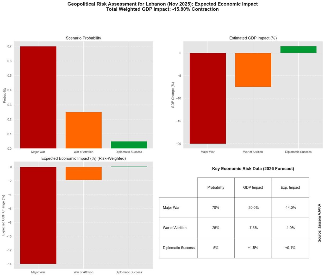 Les analyses géopolitiques indiquent une probabilité accrue d’une guerre majeure au cours des six prochains mois — d’ici la mi-2026 —, avec une estimation oscillant entre 65 % et 75 %. Les conséquences économiques et humaines pour le Liban, déjà plongé dans la pire crise financière de son histoire depuis 2019, pourraient être catastrophiques.